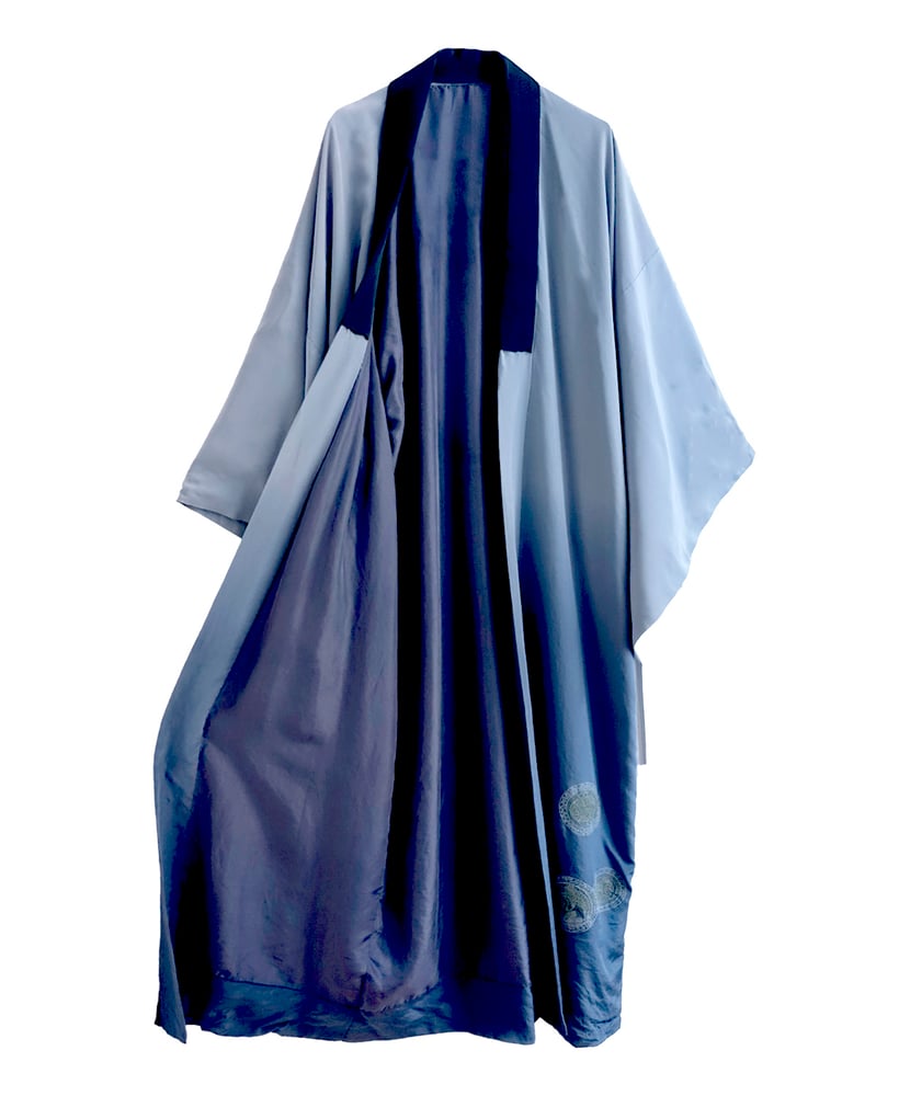 Silke Kimono dame af japansk blå silke med stjernemønster mm. -vendbar!