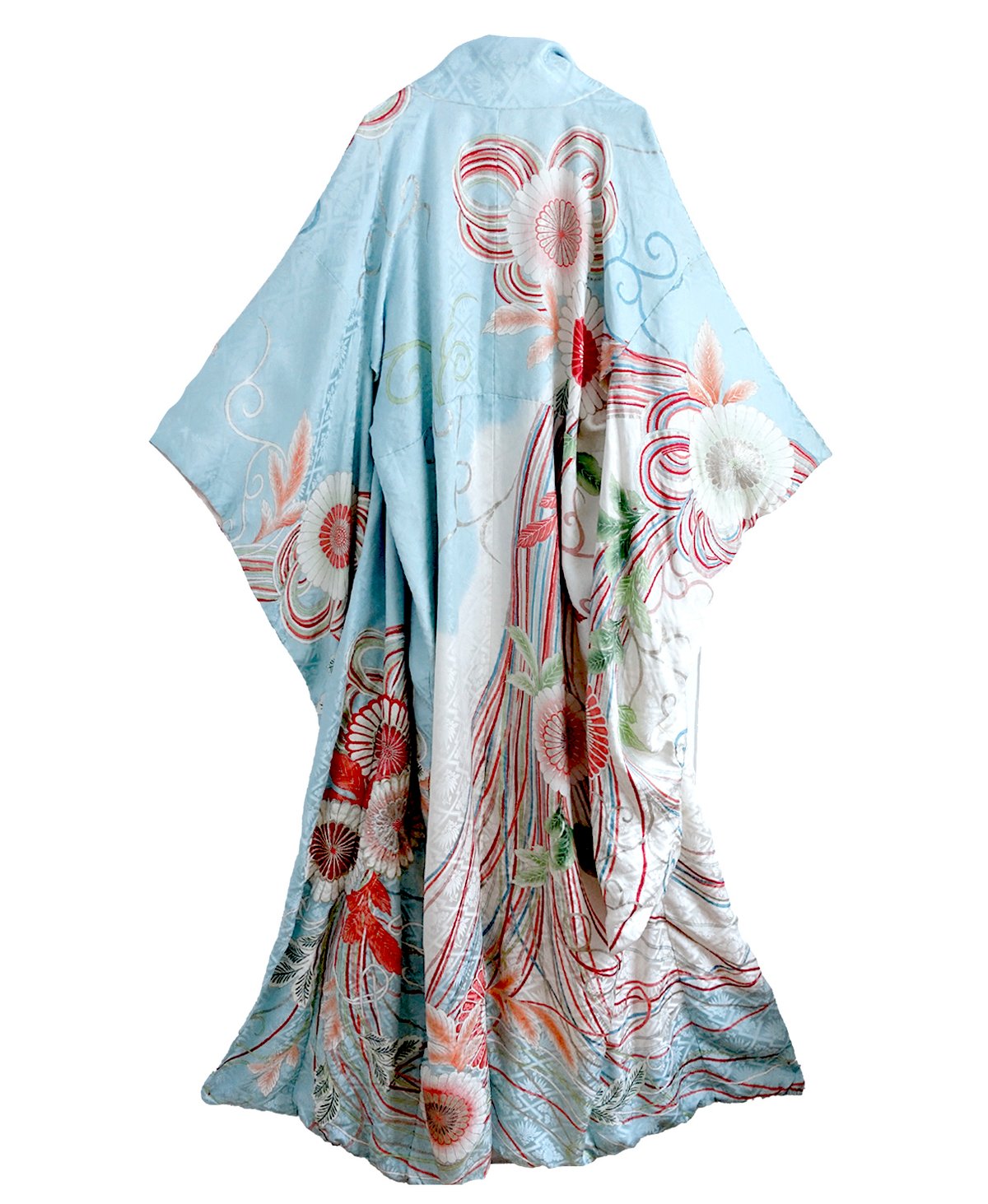 Denne furisode festkimono er som et smukt kunstværk. Lavet af en elaboreret sammensætning af forskellige håndværk. Ærmene er lange for at fremhæve kvindens ynde!. Motiverne er stiliserede blomsterrosetter m. blomstermalerier og broderier og malede sølvstriber og blomster applikationer. Der er krysantemum og blade og strege i regnbuens farver. Og i baggrunden indvævet damaskmønster i silken. Selve silken er rislende skøn, blød og har tyngde i kvaliteten.
