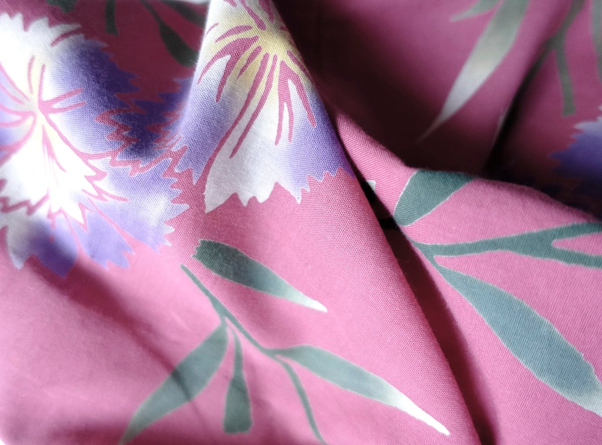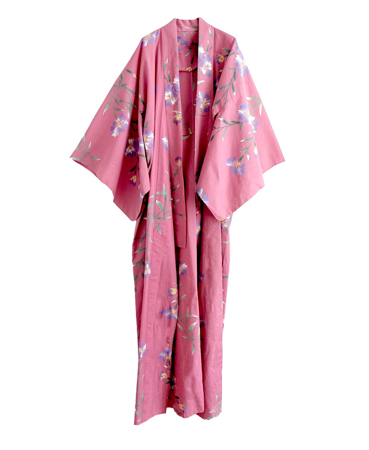 Denne  støvet rosa kimono er lavet af  100% bomuld og er dekoreret med violette blomster. Den er syet af den type bomuld der bliver blødere med tiden.