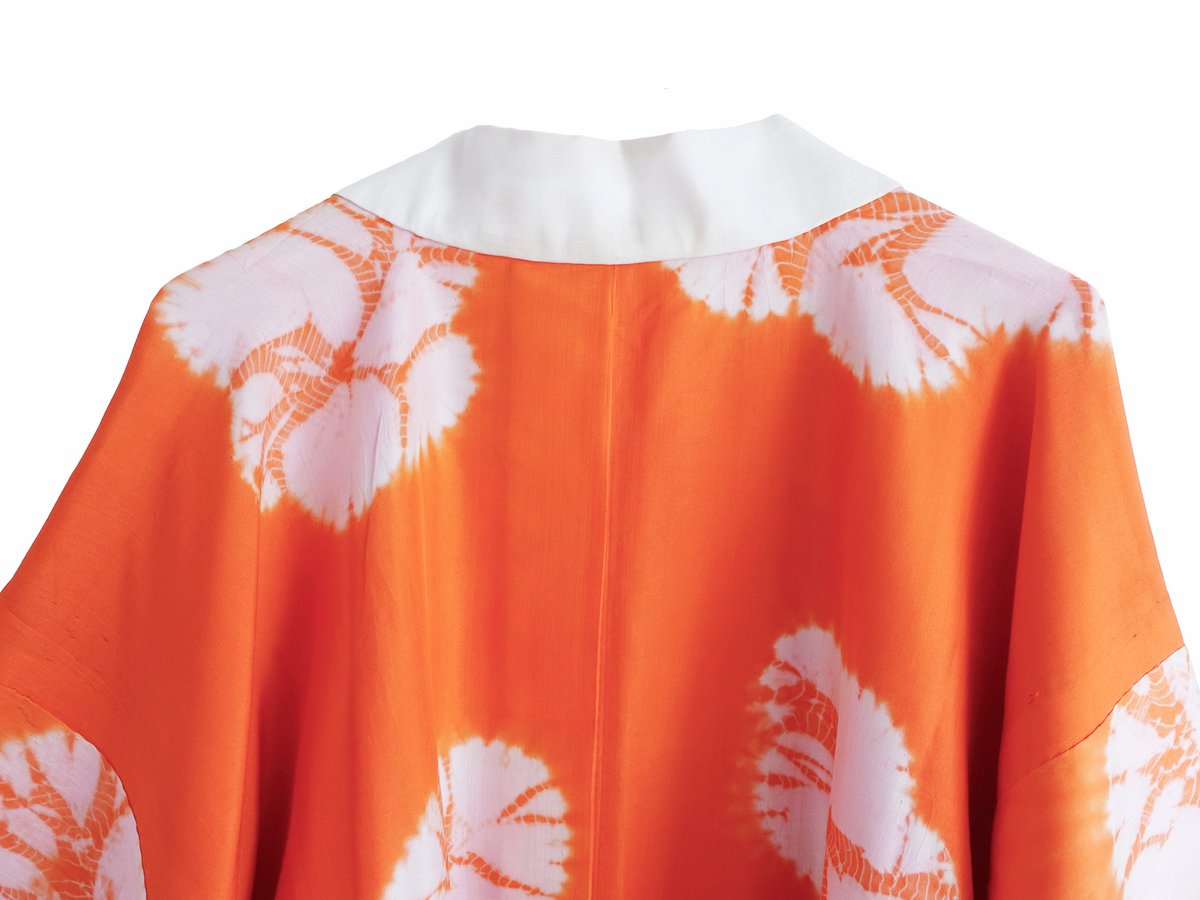 Denne fine kimono er lavet af en blød og glat silke med indfarvede shibori sakura blomsterformationer. Selve farven er skøn klar orange tone og shibori indfarvningen er en karakteristisk japansk håndværkstradition. Mønstrene har et fint kunstnerisk præg og en meget fin kimono. Denne kimono er foret med et rødt silkefor.