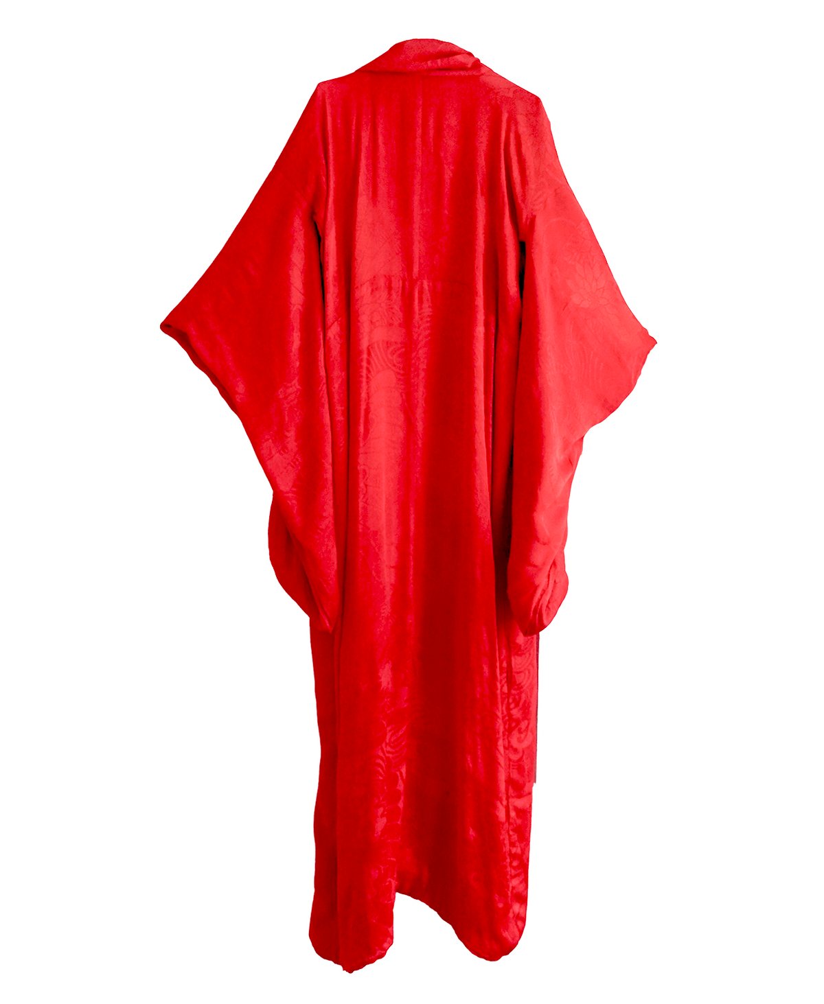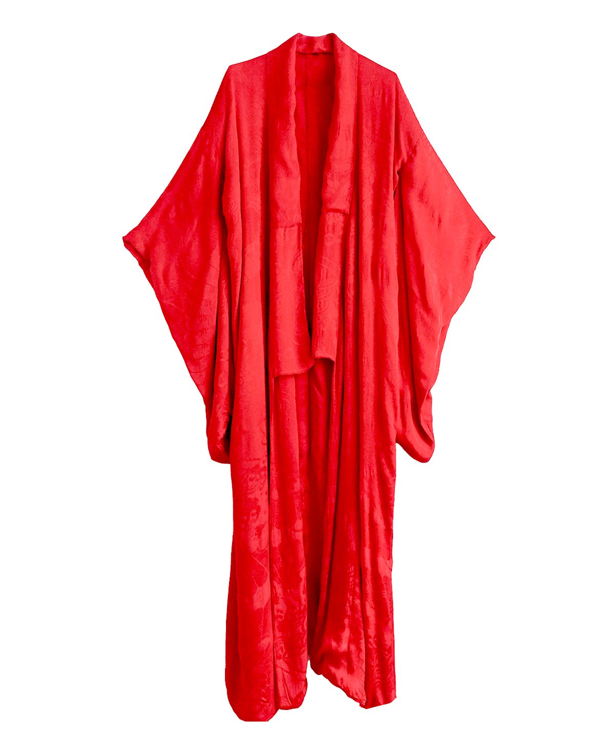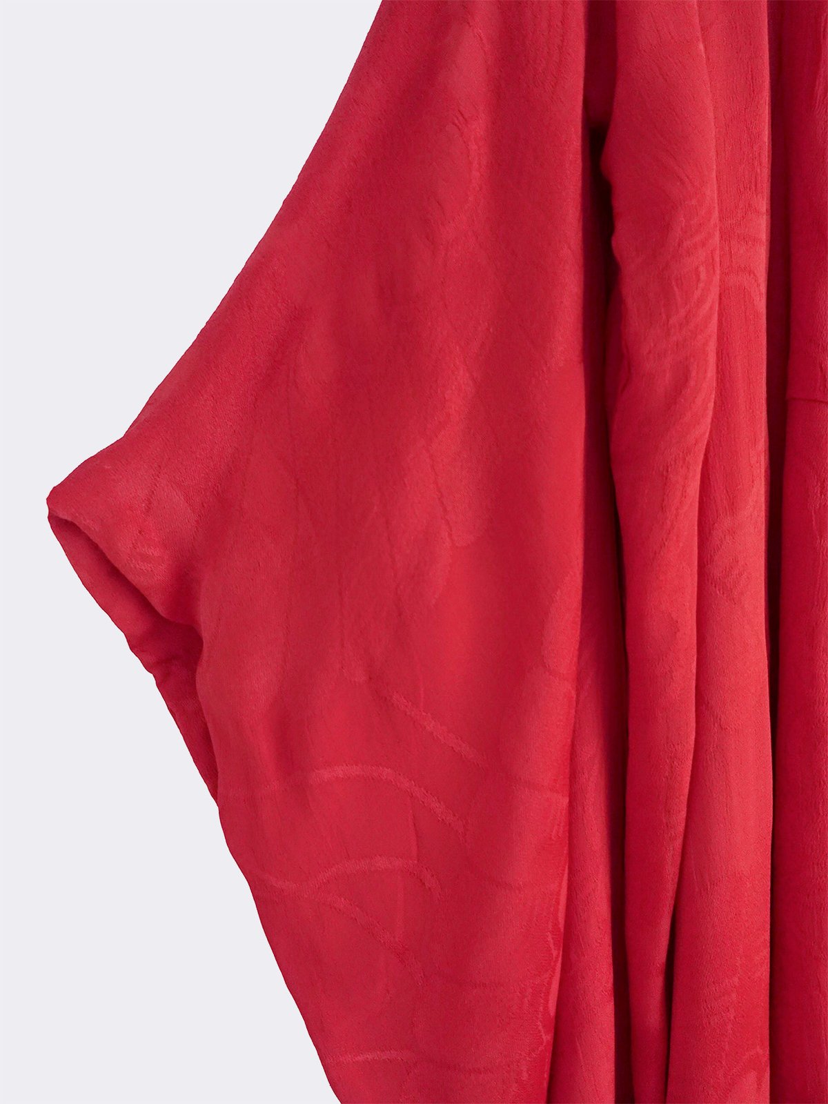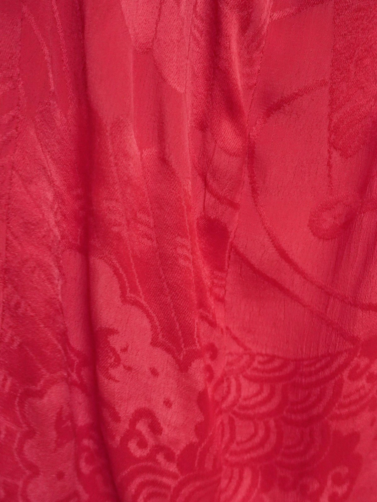 Denne magnifikke og ret usædvanlige silkekimono er lavet af en fin kvalitetssilke, den er usædvanlig blød og falder med tyngde. I silken har indvævede damaskmønstre m. bølge og fuglemotiver. Den røde farve i silken er af en meget smuk dyb og kølig nuance. For af 100% silke.