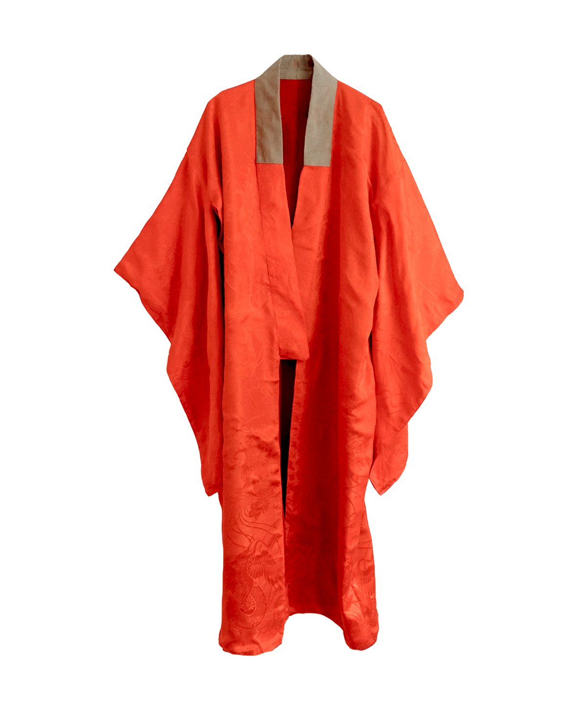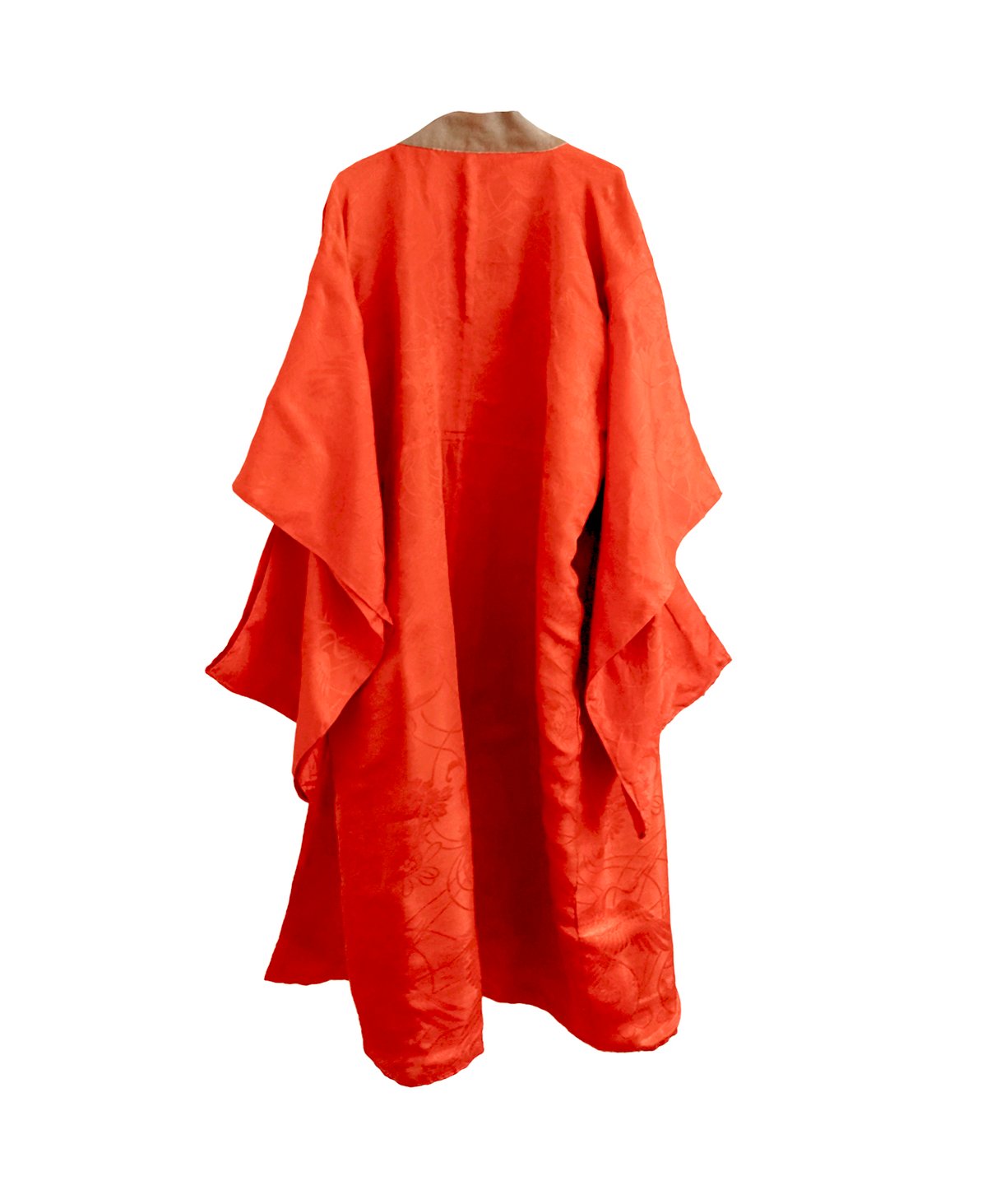 Denne fine kimono er lavet af en fin højkvalitetssilke, den er usædvanlig blød. I silken er vævet damaskmønstre m. bla. krysantemumblomster. Den røde farve i silken er af en meget smuk koralrødlig nuance. For af 100% silke. Kraven er grå lavet af bomuld. Kan både anvendes som kimono og som lang åbenstående jakke.