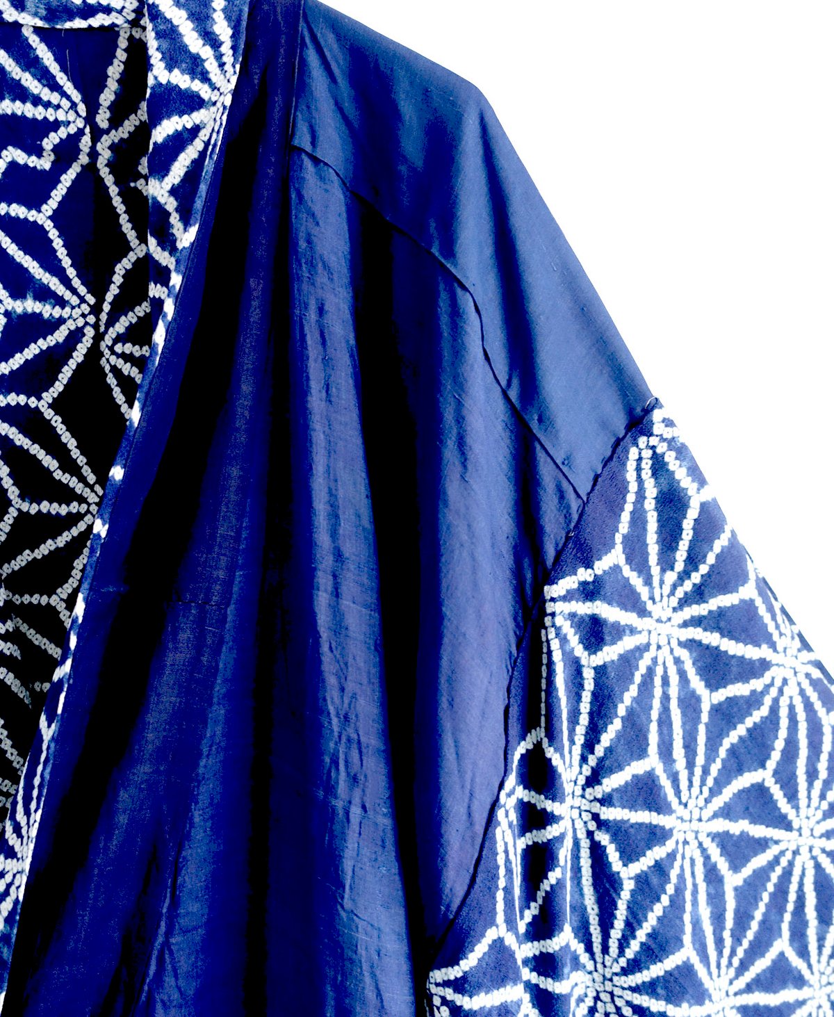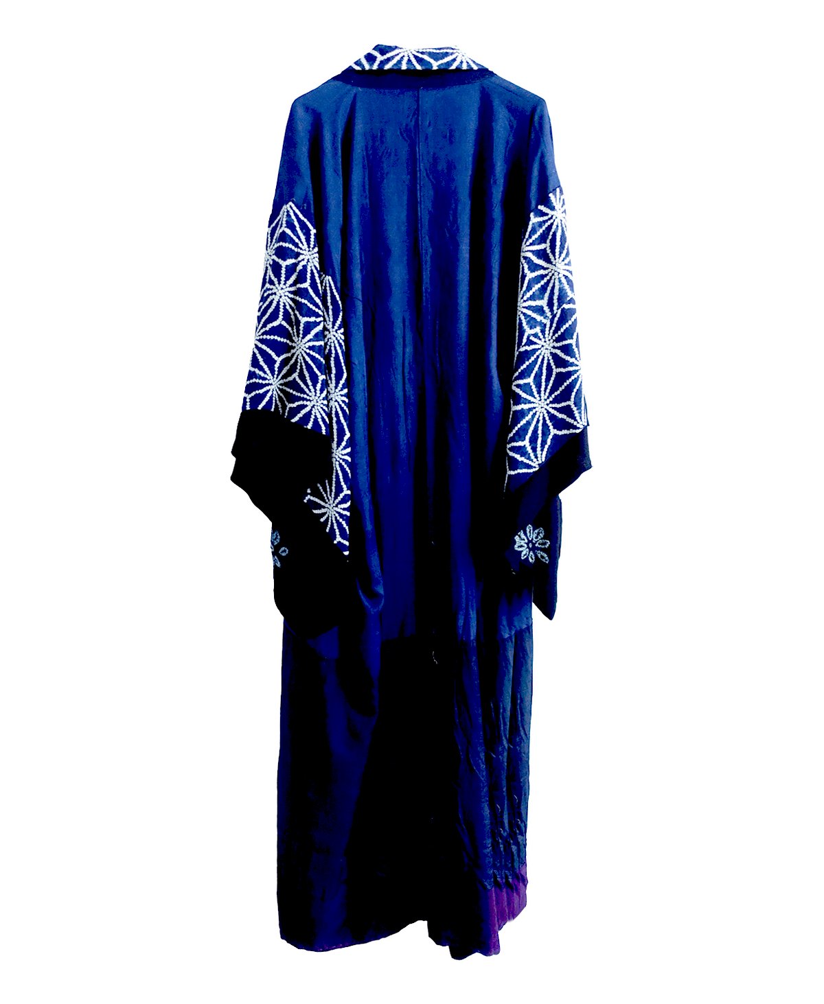 Denne uforlignelige smukke silkekimono er som et kunstværk med fortællinger om en hel parade af japansk kunsthåndværksteknikker. Ærmerne er indfarvet med shibori blomster på den eksklusive crepes-silke. Bærestykket er dekoreret med shiboristjerner og ml.stykket af en blommelila glattere silke med shibori abstrakte mønstre. Foret af lavet af en indigoblå 100% bomuld som er ekstra blød og behagelig. Et lille mesterværk. Og den kan desuden vendes!